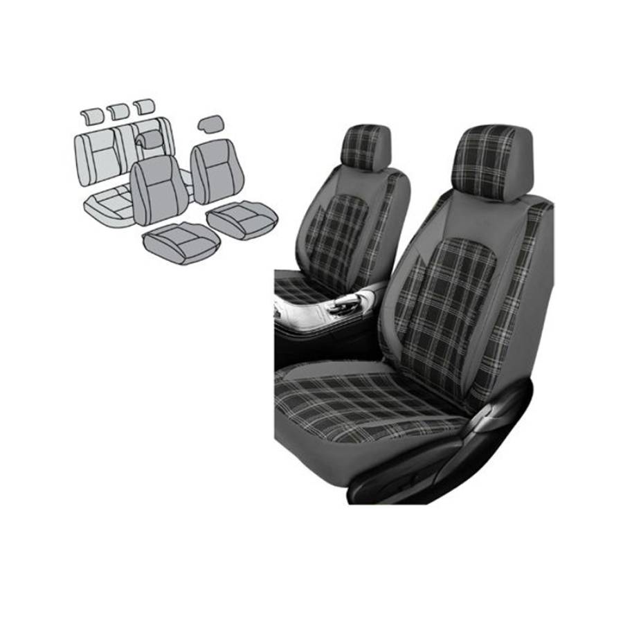 11piece Seat Cover Set – Tartan Design Black & Grey Pattern with Grey PVC Trim