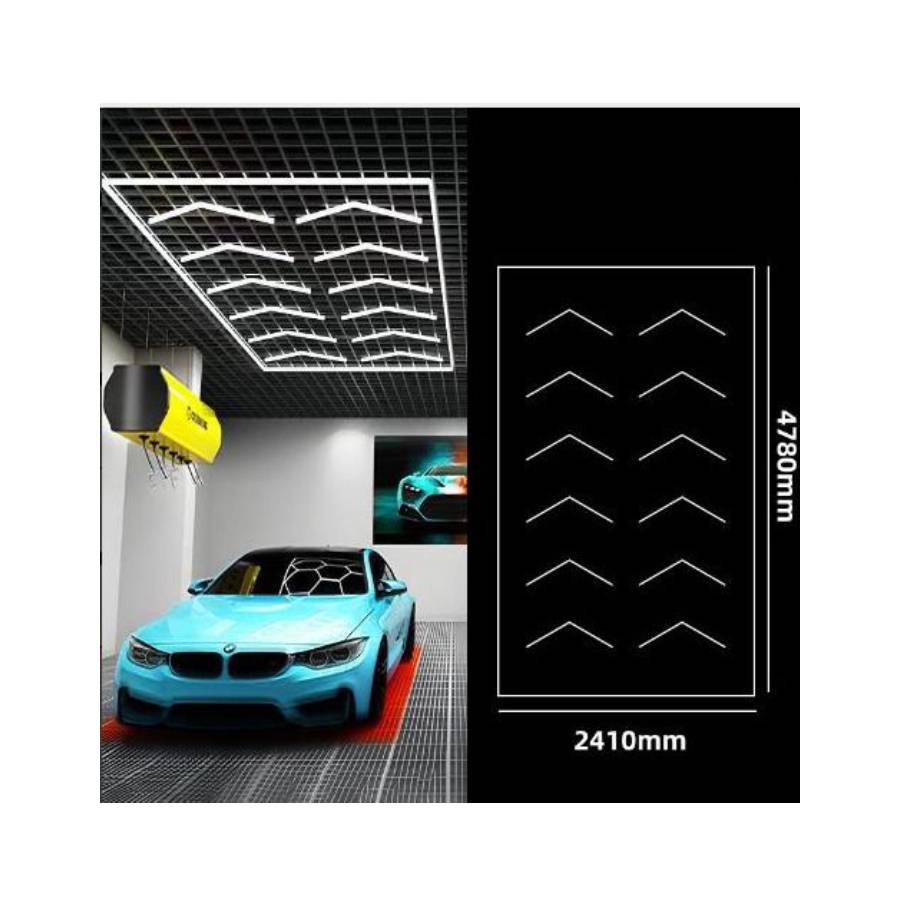 Arrow pattern LED ceiling light with a distinctive modern layout for garages, detailing bays and automotive showrooms. Sized at 2410 x 4780mm, it delivers bright, even lighting while creating a dynamic ceiling feature. Perfect for spaces that need clear working light with a unique design edge.