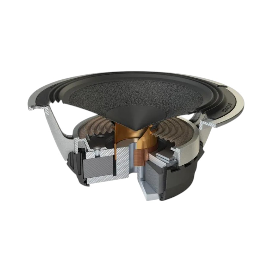 Originating directly from the experience of the Thesis line components, the Voce woofer features an aluminium basket with a great aerodynamic structure, a cotton-fibre paper pressed cone with Light Damping treatment, a Triple Wave surround in butyl rubber and extremely light Copper Clad Aluminium Wire coils.