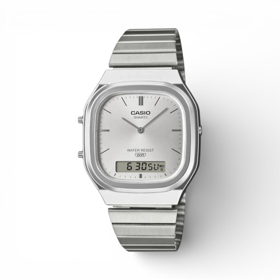 The Casio AQ-240E-7ADF combines classic analog styling with practical digital functionality in a clean, versatile design. Featuring a crisp white dial with silver-tone hour markers and a digital display window, this timepiece delivers the perfect balance between retro aesthetics and modern usability.
