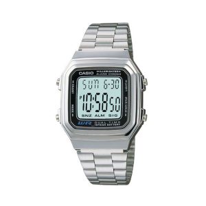 This retro-looking black Casio men’s digital watch features a calculator and sturdy resin strap. Special features include 50-metre water resistance, a stopwatch, daily alarm and 12/24-hour format.
