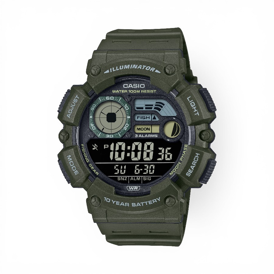 A rugged and practical digital sports watch built for outdoor use, the Casio WS-1500H-3BVDH features a bold oversized display, green resin strap, and a range of useful functions for everyday wear and adventure. Designed with anglers and outdoor users in mind, it includes moon data, a fishing level indicator, dual time, LED backlight, and 100-meter water resistance.