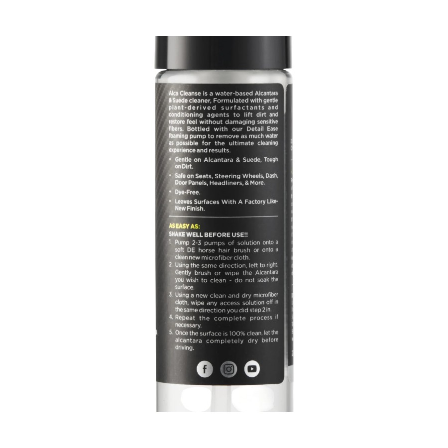 Alca Cleanse is a Water-based Alcantara & Suede cleaner, Formulated with gentle plant-derived surfactants and conditioning agents to lift dirt and restore feel without damaging sensitive fibers.