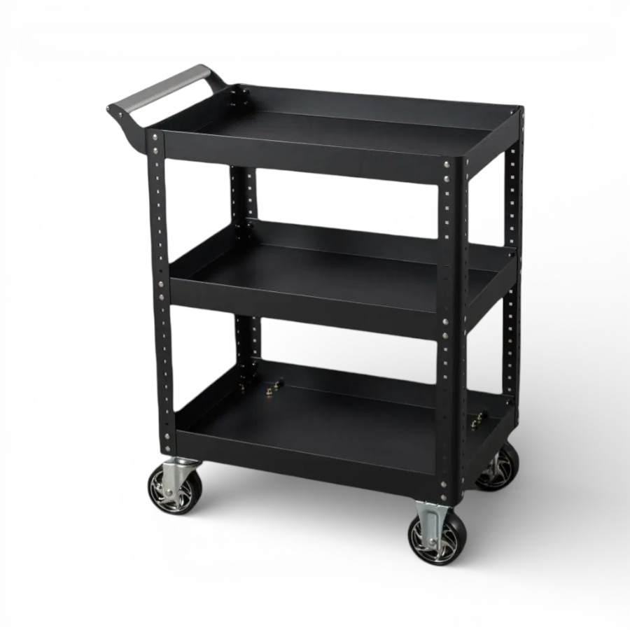Heavy-duty 3-tier steel workshop trolley with adjustable tray positions, aluminum handle and smooth-rolling castors — ideal for garages, workshops and industrial use.
