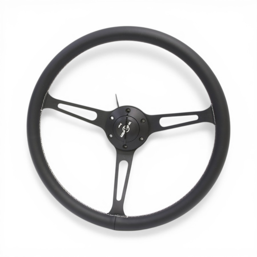 GripForge Black Leather Steering with White Stitching & Matt Black 3-Spoke Center – 380mm