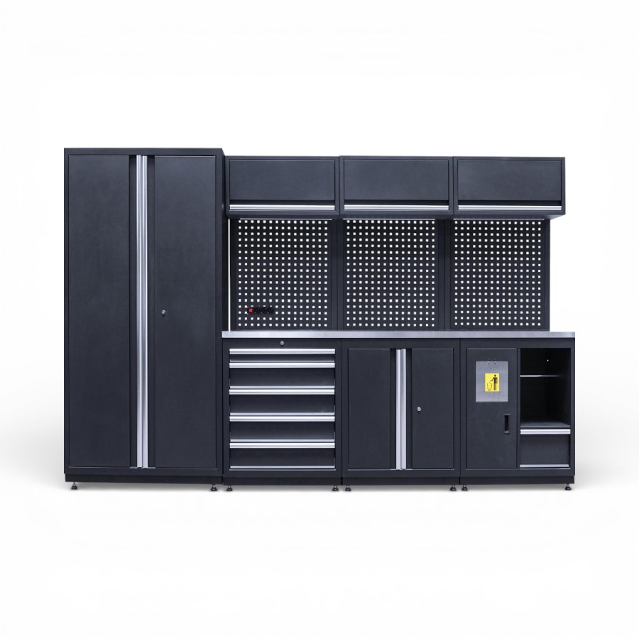 Modular Storage Configuration – Combines wall cabinets, base cabinets, tall storage and drawer units for versatile tool organisation