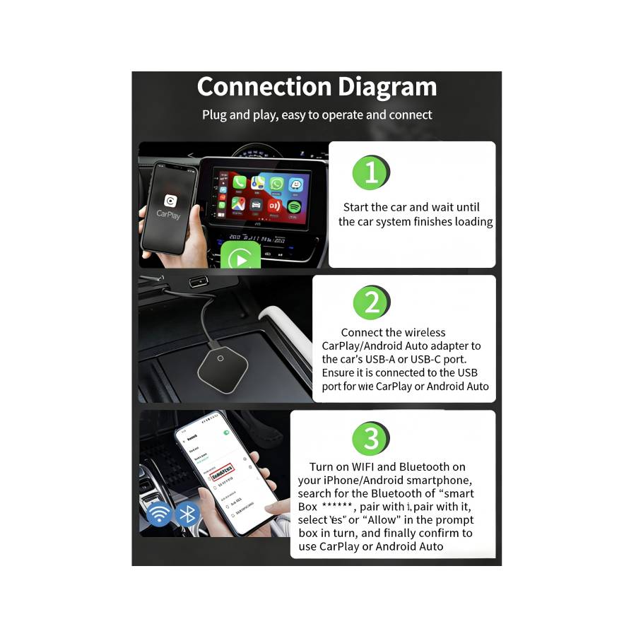 Simply connect the adapter to your vehicle’s CarPlay or Android Auto USB port using the supplied cable, pair your smartphone via Bluetooth and WiFi, and enjoy wireless access to navigation, calls, music, messaging, voice assistants and supported apps on your original car screen.