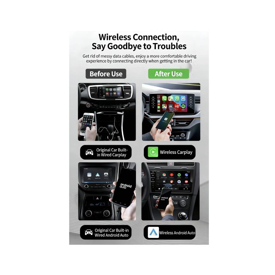 Upgrade your vehicle’s factory infotainment system with the Mini S3 Wireless CarPlay and Android Auto Adapter. This compact plug-and-play adapter is designed for cars that already have built-in wired Apple CarPlay or wired Android Auto, allowing you to enjoy the same familiar interface without needing to connect your phone with a cable every time you drive.