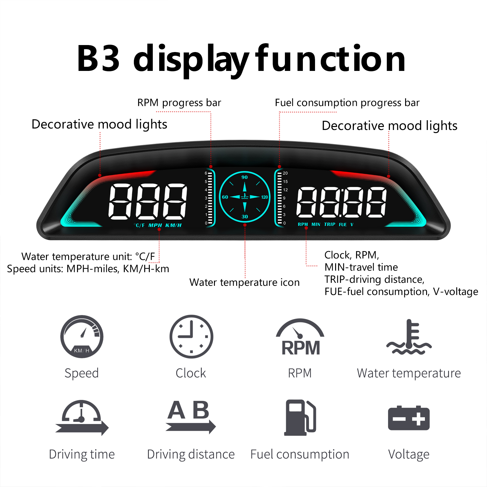 The B3 OBD2 HUD provides a safer, smarter driving experience by projecting real-time data directly onto your windshield. With instant display of speed, RPM, water temperature, voltage, and fuel consumption, this compact display helps you monitor vital car stats without taking your eyes off the road.