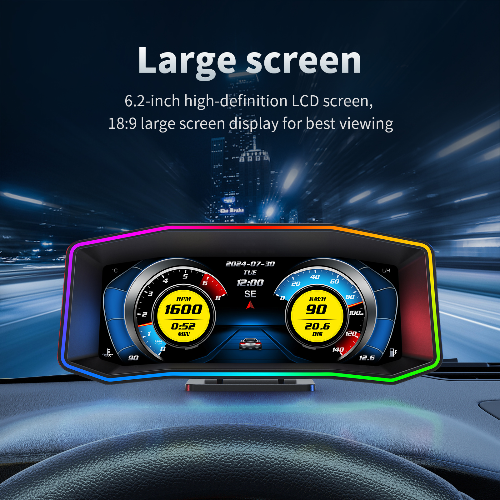 P4 OBD2 HUD Display With GPS – 6.2″ LCD, Multi-Color Atmosphere Light, Diagnostic & Driving Data Monitor
