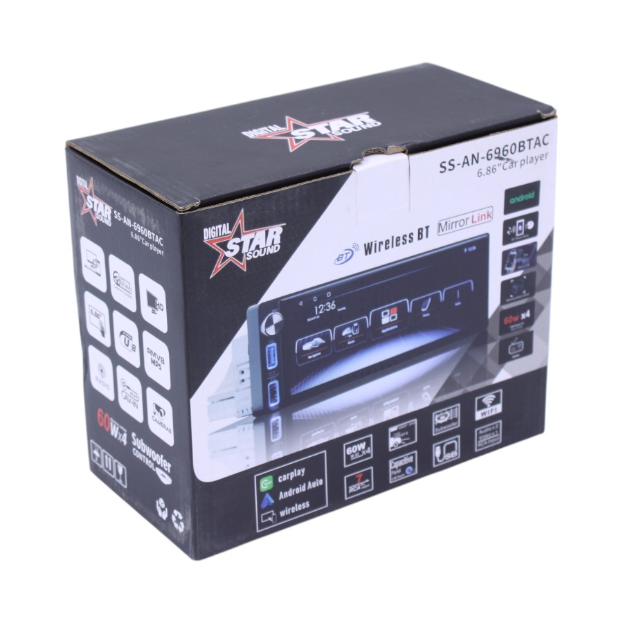 Upgrade your driving experience with the Starsound SS-AN-6960BTAC, a 6.86-inch touchscreen car media player packed with modern features. Enjoy seamless wireless Bluetooth connectivity, Mirror Link support for Android devices, and immersive audio through its powerful 60W x 4 output. Whether you’re streaming music, making hands-free calls, or navigating via your smartphone, this unit delivers convenience and performance. With support for CarPlay and Android Auto, plus subwoofer connectivity and USB input, it’s designed for the ultimate in-car entertainment.