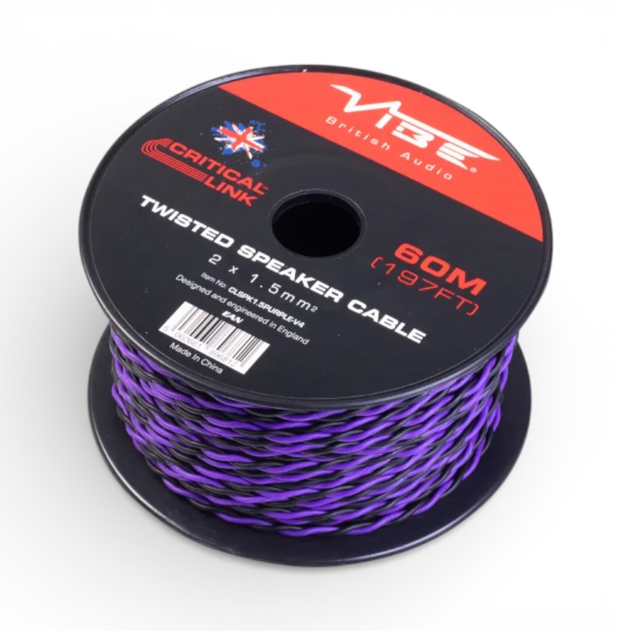 Purple twisted speaker cable 100% OFC Oxygen Free Copper 60m spool 2 x 1.5mm2 16AWG twisted pair suitable for post-amplifier routing and superior noise rejection.
